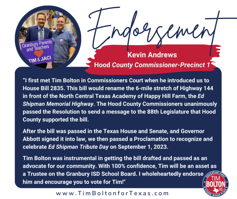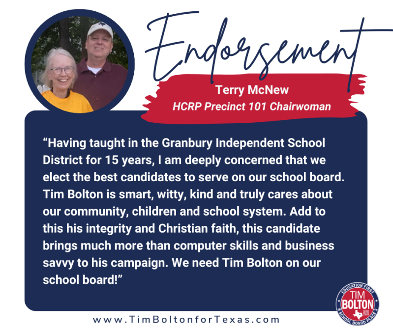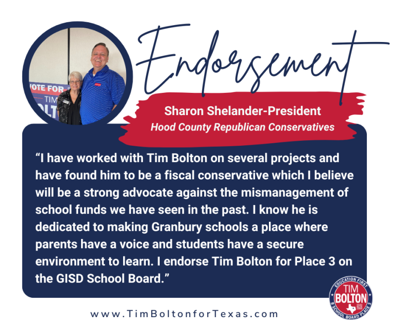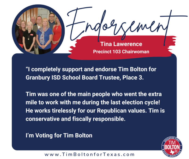 "Tim has proven himself as a strong constitutional conservative leader who will be an advocate and true voice for parents, while looking out for the interests of all taxpayers. I'm proud to endorse Tim Bolton for Granbury ISD School Board Trustee, Place 3!"